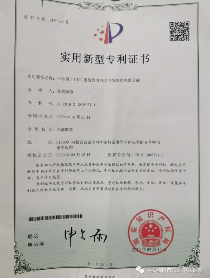 呼和浩特市“十三五”科技创新成果展于9月25日在呼和浩特科创中心开展,本次展览是第八届内蒙古“草原英才”高层次人才合作交流会暨呼包鄂乌人才创新创业周呼和浩特市主会场的一项重要活动。展览从科技创新引领工业发展新动能、科技助推现代农牧业发展、科技创新惠民生、科技创新载体建设、产学研合作、科技英才、科技特派员工作等方面充分展示了“十三五”以来呼和浩特市科技创新工作取得的显著成就。成果展以图片、模型、实物和多媒体为呈现手段,展示出了呼市“十三五”期间涌现出的科技人才和在新材料、新能源、生物医药、现代农牧业、医疗卫生健康等多个领域的150余项科技成果。其中中文色情网 蒙医心病科苏都斯琴的实用新型发明专利(一种用于PICC 置管患者预防并发症的热敷套袖)入选参展。该专利的展出为医院科技创新工作挣得了荣誉。