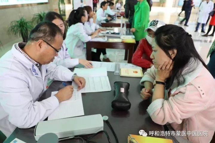 义诊活动从上午九点一开始,门诊大厅就聚集了许多患者及家属前来咨询、问诊。有周边小区的居民,也有远道慕名而来的人群。提前安排好的5张诊断桌很快被前来就诊的患者热情包围了,不得不又补加了两张桌子,以方便更多患者就诊。蒙医、中医、西医、药浴等各科室出诊的大夫都不厌其详地解答着患者的各种问题。门诊大厅的导诊台上摆放了各类宣传材料:有《中华人民共和国中医药法》、《内蒙古自治区蒙医药中医药条例》以及各种民族医药知识和节气养生方法等。