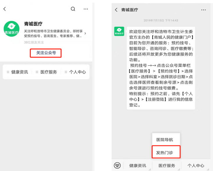 (1) 微信关注公众号“青城医疗”,进入公众号选择下方的“医疗服务”,点击“发热门诊”即可进入。