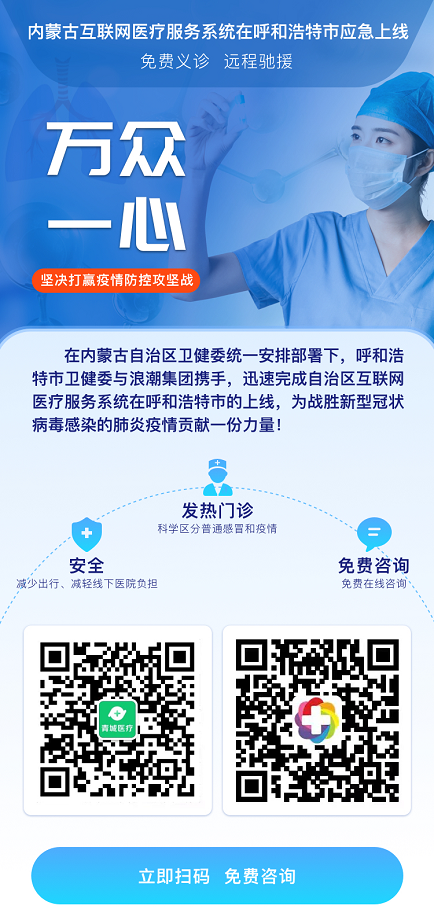为增加市民咨询就诊的便利性,降低新型冠状病毒传播风险,从即日起,呼和浩特市卫生健康委组织我市18家医院入驻内蒙古互联网医疗服务系统,并率先开通了我市互联网发热咨询门诊,市民足不出户就可以通过手机实现与医院专科医生直接沟通,欢迎有需要的市民向各医院医生咨询问诊,该门诊目前实行免费咨询,提供诊疗建议。