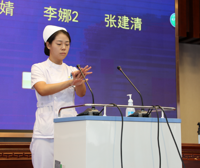 本次比赛分为护理实习生组和医师实习生组,采取电脑随机抽取的方式,分别抽出30名护理实习生、50名医师实习生参赛。评委组由医务科、护理部、感染科、教学秘书、教学办公室等部门组成,按照“七步洗手法”评分细则考核。细则分为洗手指征、行为举止、操作前准备、评估、操作过程、终末质量及时间等进行。比赛中参赛选手发挥稳定、以良好的专业素质给评委老师留下深刻影响。